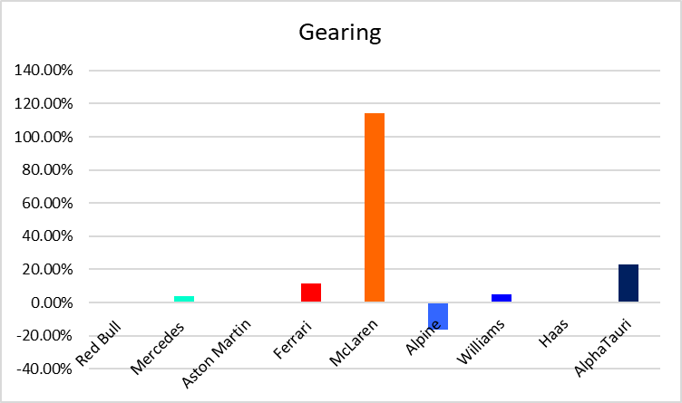 The gearing ratio (my absolute favourite financial ratio) compares a business’ long term debts to its resources (capital employed). Now with F1 teams some have very little borrowing meaning their ratio is kind of irrelevant. Also, note that a higher number is worse in this.